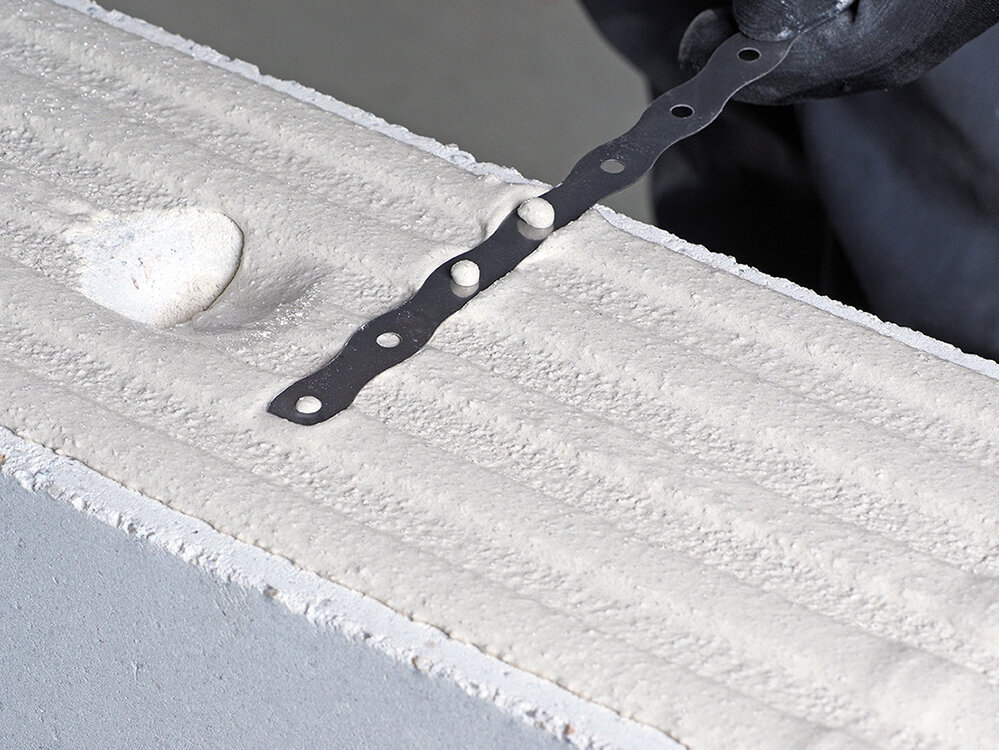 Beim Aufmauern wird der Edelstahl-Flachanker im Mörtelbett eingelegt.